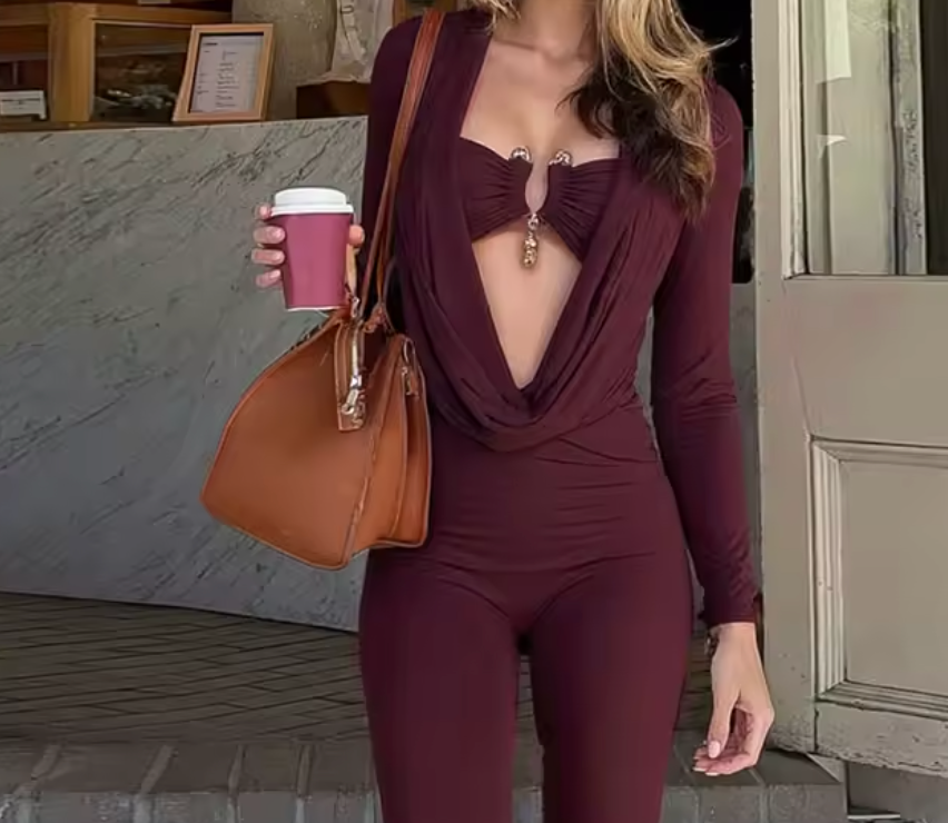 Tuta aderente dal design audace e ultra femminile, caratterizzata da un profondo scollo drappeggiato e dettaglio centrale gioiello che valorizza il décolleté.